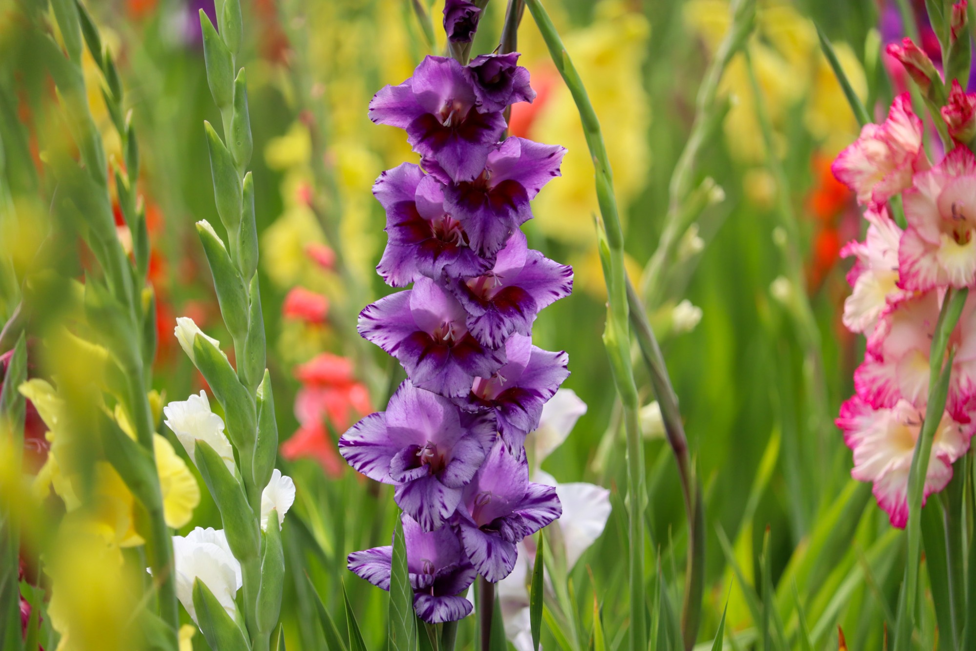 Wenn die Blühfarbe an den unteren Knospen erkennbar ist. Blütenstiele ganz unten abschneiden. Auch bereits blühende Gladiolen halten sehr lange in der Vase.